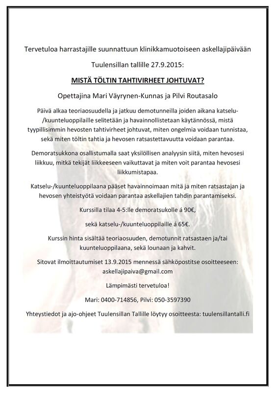 Mistä hevosten tahtivirheet johtuvat? Miten ongelmia voidaan tunnistaa? Miten töltin tahtia ja hevosen ratsastettavuutta voidaan parantaa? Kurssi Tuulensillassa 27.9. Opettajina ratsastusvalmentaja Mari Väyrynen-Kunnas ja kilparatsastaja Pilvi Routasalo. Hinta 65,-. Sitovat ilmoittautumiset Pilville ja Marille 13.9.2015 mennessä sähköpostitse osoitteeseen: askellajipaiva@gmail.com |
