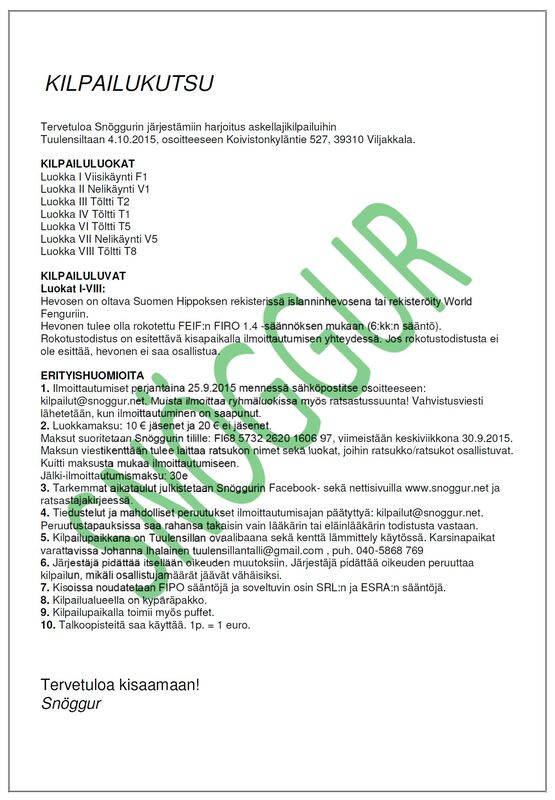 Tervetuloa Snöggurin järjestämiin harjoitus askellajikilpailuihin! Kilpailupaikalla toimii myös puffet. Lue lisää Pirkanmaan paikalliskerho Snöggurista |