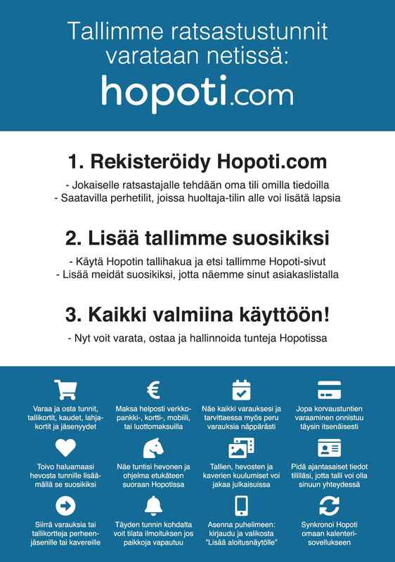 Olemme siirtyneet sähköiseen ajanvarausjärjestelmään. Näet kaikki tulevat, vapaat maastoratsastusajat ja syksyn tuntipaikat täältä "varaus" -kohdasta: